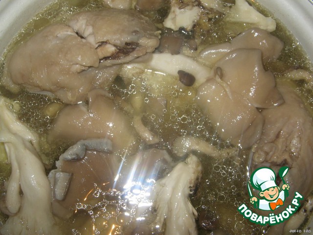 Отвариваем курицу и грибы.