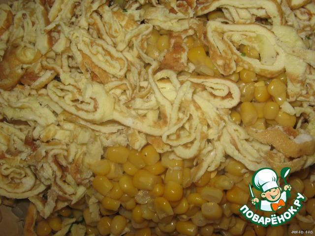 В салат добавляем кукурузу, блинчики и лук, хорошо его отжав от уксуса.