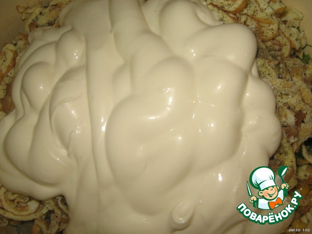 Заправляем майонезом, слегка солим, перчим.