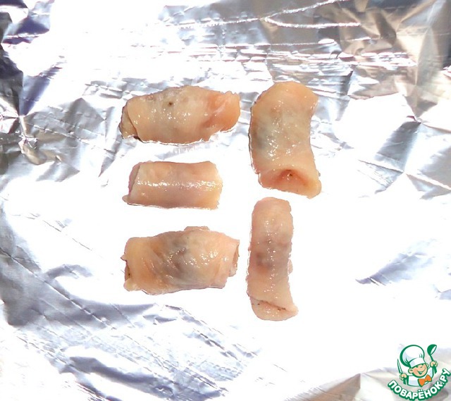 Куриное филе нарезать на полоски, отбить, посолить, посыпать сушеным базиликом.