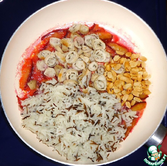Добавить рис, кусочки куриных рулетиков, арахис, перемешать.
