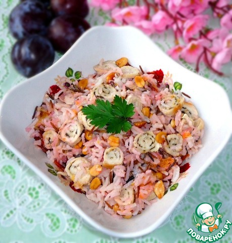 Тёплый рисовый салат с курицей, сливами и арахисом готов!