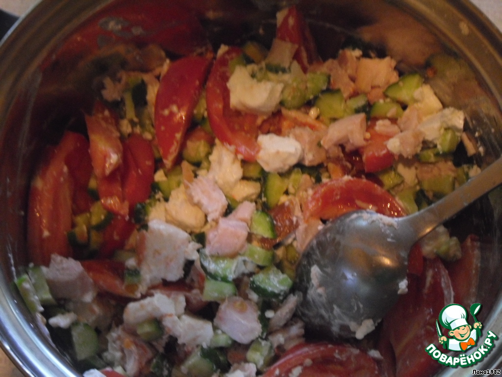 Курицу, сыр, огурец нарезать кубиками. Помидор крупными дольками. Все перемешать,