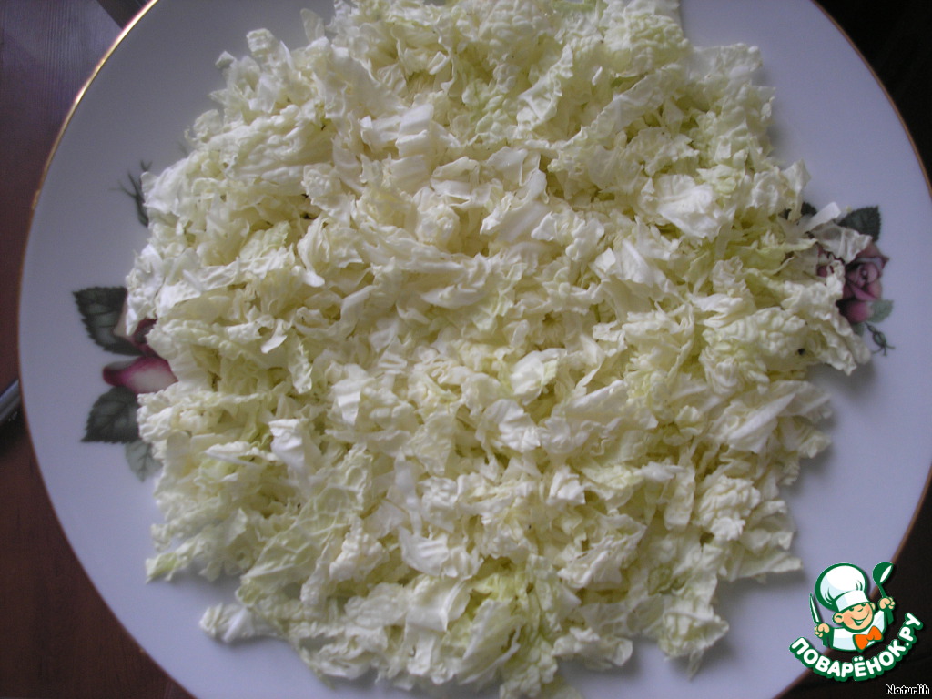 Мелко шинкуем пекинскую капусту и выстилаем из нее подстилочку для нашего салатика.