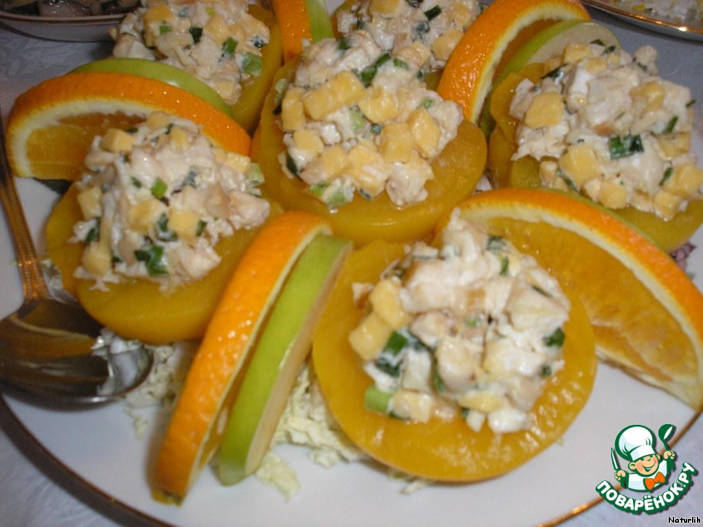 Наполняем половинки консервированных персиков подготовленным салатом-начинкой и выкладываем на капусту. Украшаем дольками апельсина и яблока. Подаем к столу.
