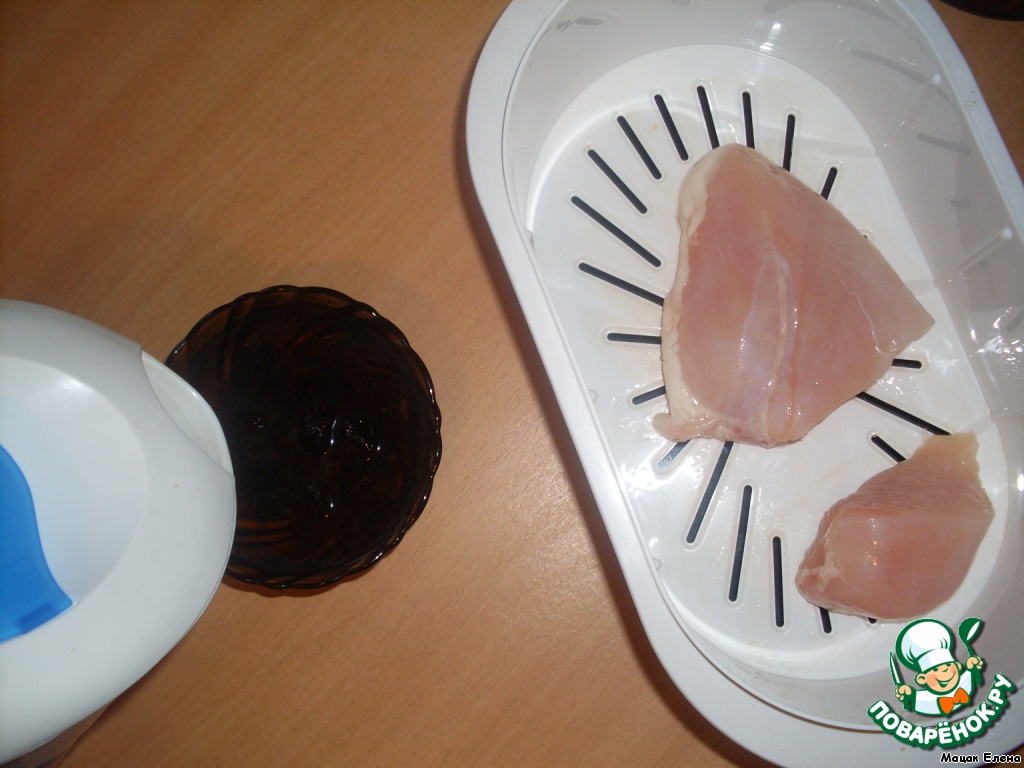 Чернослив залить кипятком, оставить на 10 минут. Куриное филе готовить в пароварке в течение 15 минут.