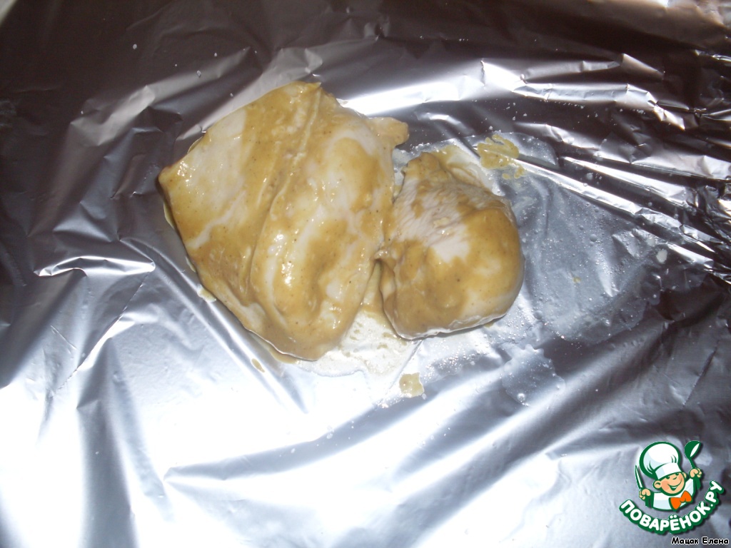 Вынуть и посолить мясо. Обмазать мясо горчицей с двух сторон, обернуть пищевой фольгой и запечь в духовом шкафу в течение 10 минут.