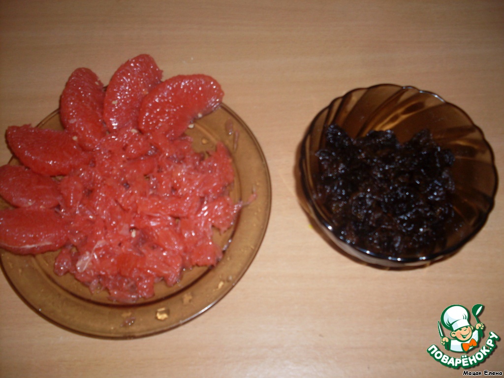 Крупно нарезать каждую ягоду чернослива. Мякоть грейпфрута, очищенную от пленок, нарезать.