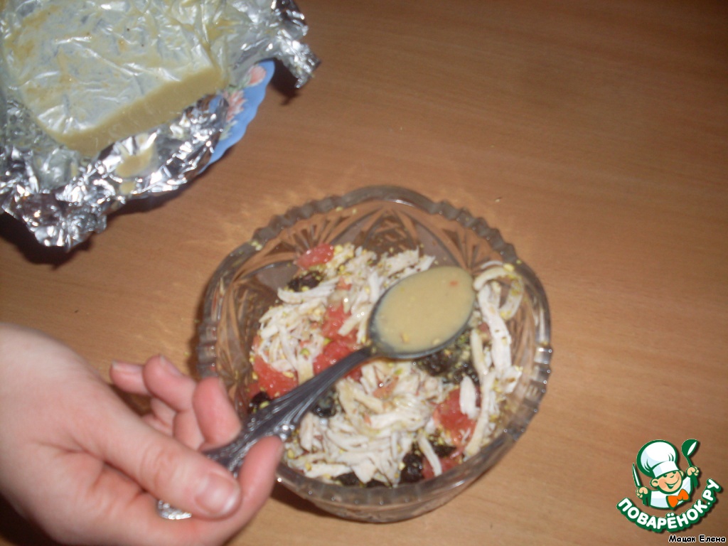 Все ингредиенты смешать и заправить соком, оставшимся от приготовления курицы, и майонезом.