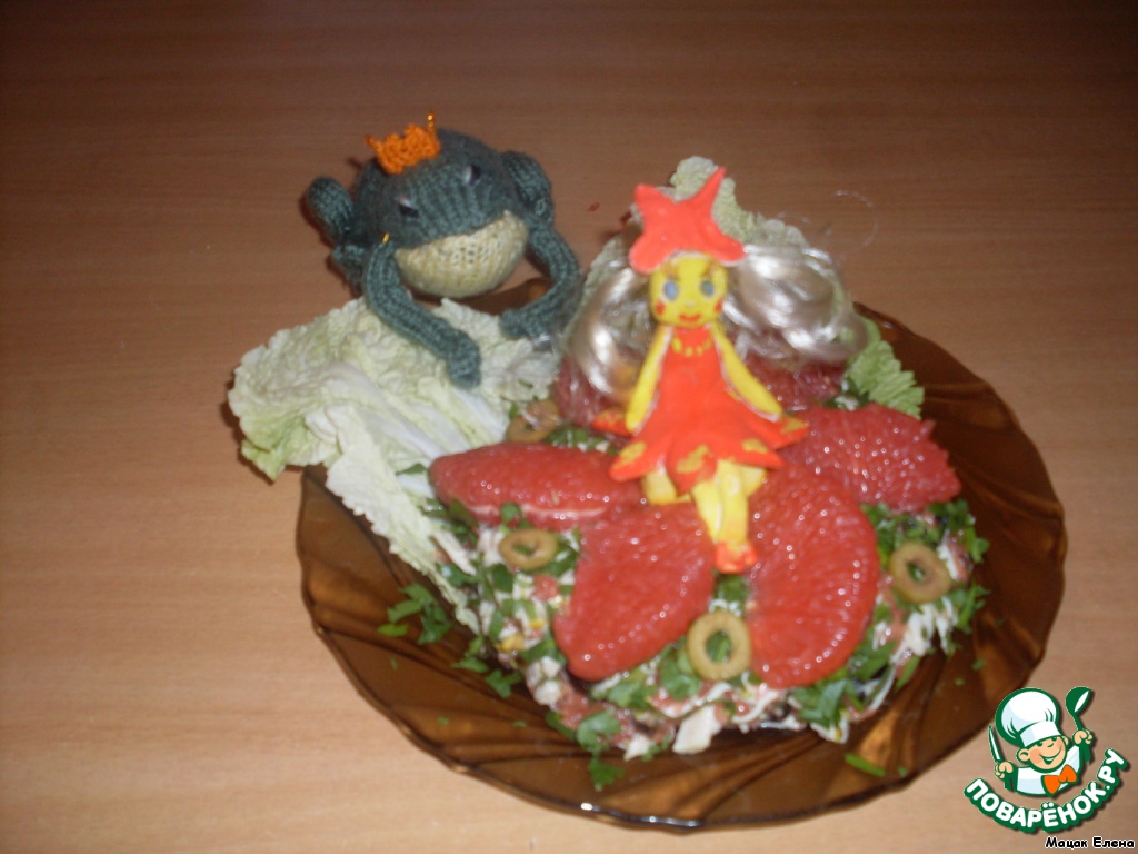 Выложить салат на листья салата, посыпать петрушкой, украсить дольками грейпфрута, сложив их в виде цветка. В середину посадить дюймовочку из соленого теста.