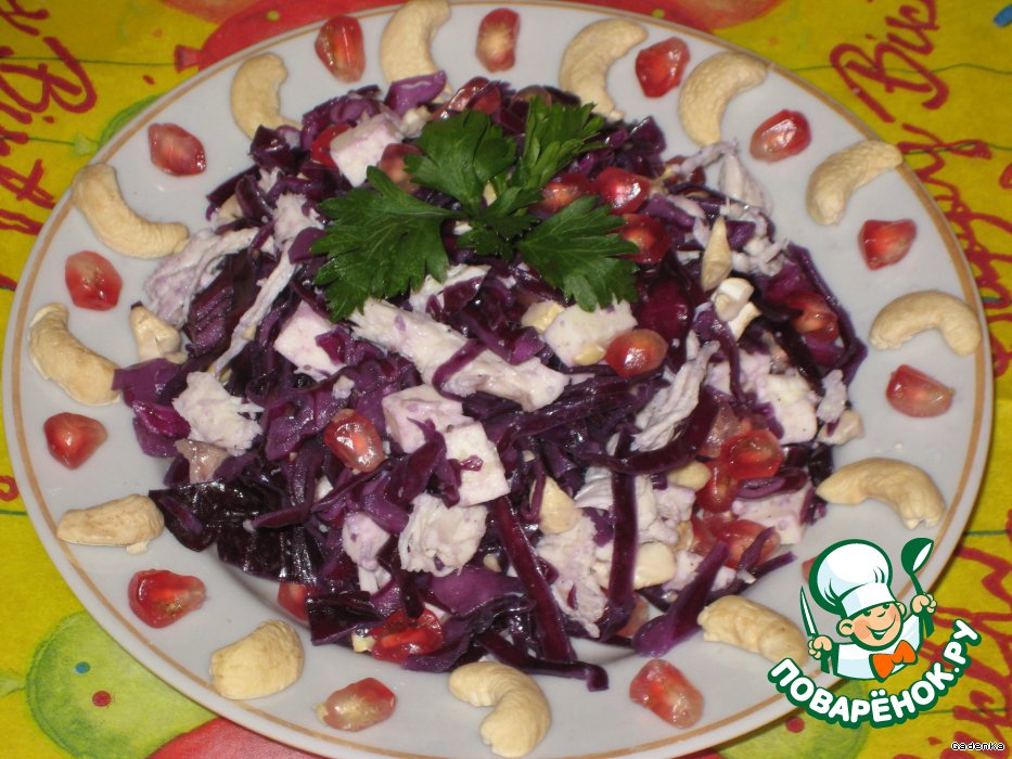 Смешать капусту, сыр, куриную грудку, орешки и гранат.