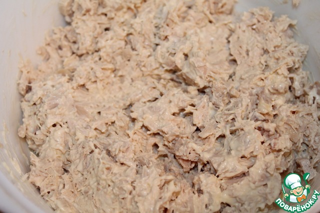 Отвариваем курицу в подсоленной воде. Я использовала мясо с голеней. Можете использовать филе. Мясо нарезаем мелкими кусочками и перемешиваем с майонезом.
