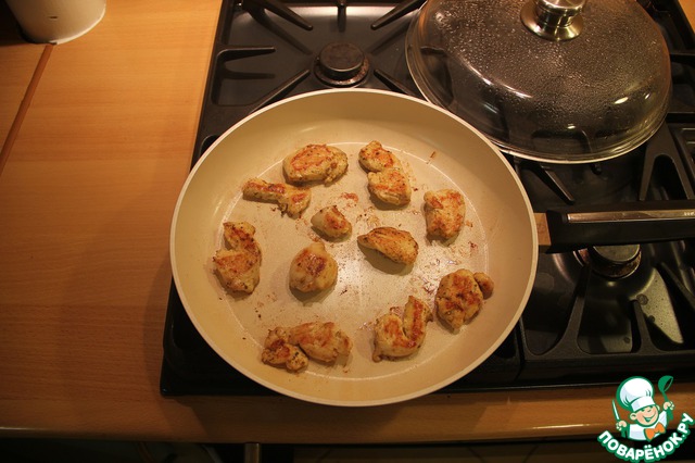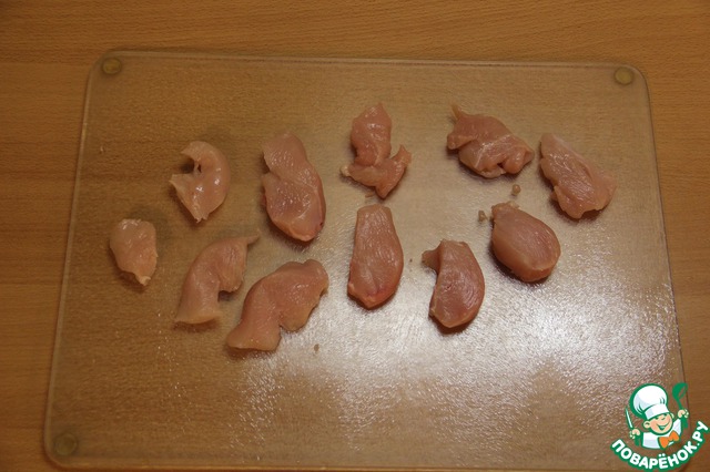 Половину куриной грудки нарезаем на среднего размера кусочки.