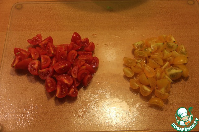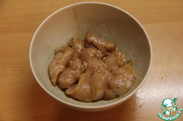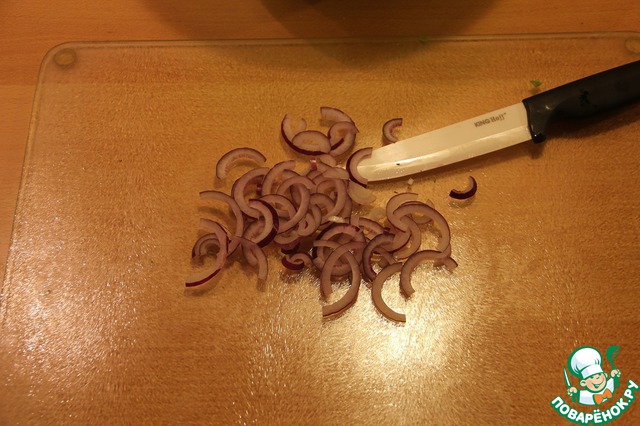Мясо в маринаде ставим на полчаса в холодильник и приступаем к нарезке ингредиентов.