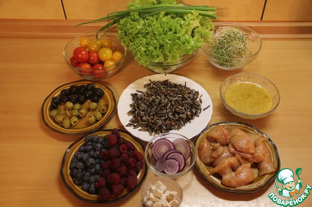 | Представляю вашему вниманию мой авторский салат. Вкус - "ни в сказке сказать, ни пером описать". Этот вкус можно только прожить. Соединение специфического вкуса дикого риса с овощами и ягодами и с соответcтвующей заправкой придаёт салату неповторимый вкус. В одной порции: Белки - 32,37 г; Углеводы - 35,73 г; Жиры - 18,06 г; Калорийность - 434,44 ккал. |