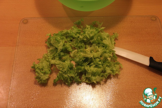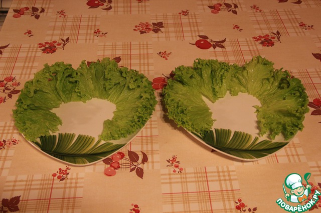 Обрезаем четыре листа салата и укладываем на тарелке.
