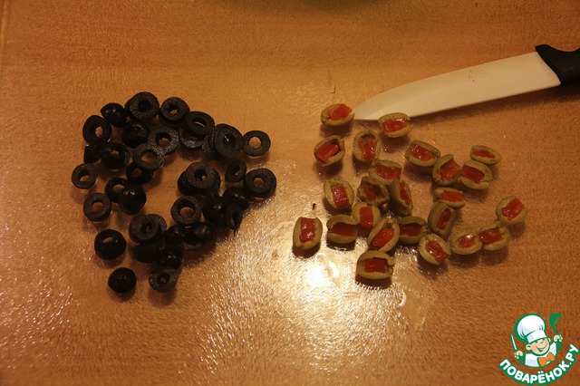 Чёрные оливки нарезаем кружочками, зелёные - пополам.