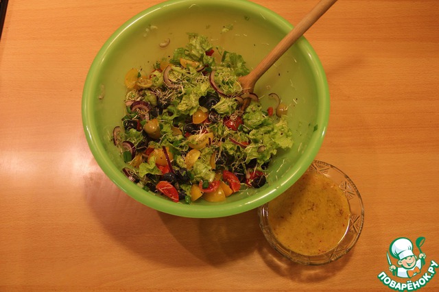 Заправка: перец молотый белый, половина красной луковицы, измельченной в блендере, соль, горчица, масло оливковое, сок из лимона.