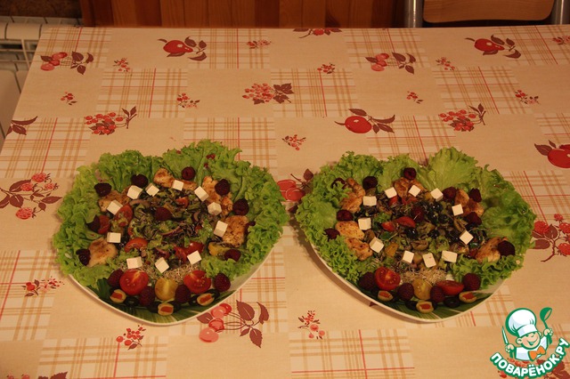 Выкладываем получившийся салат и мясо на тарелки, украшаем фетой и ягодами малины.