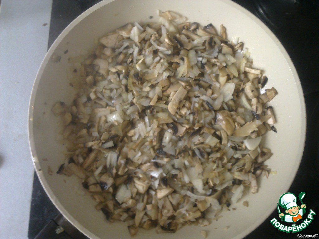 мелко нарезаем шампиньоны и лук и обжариваем на растительном масле