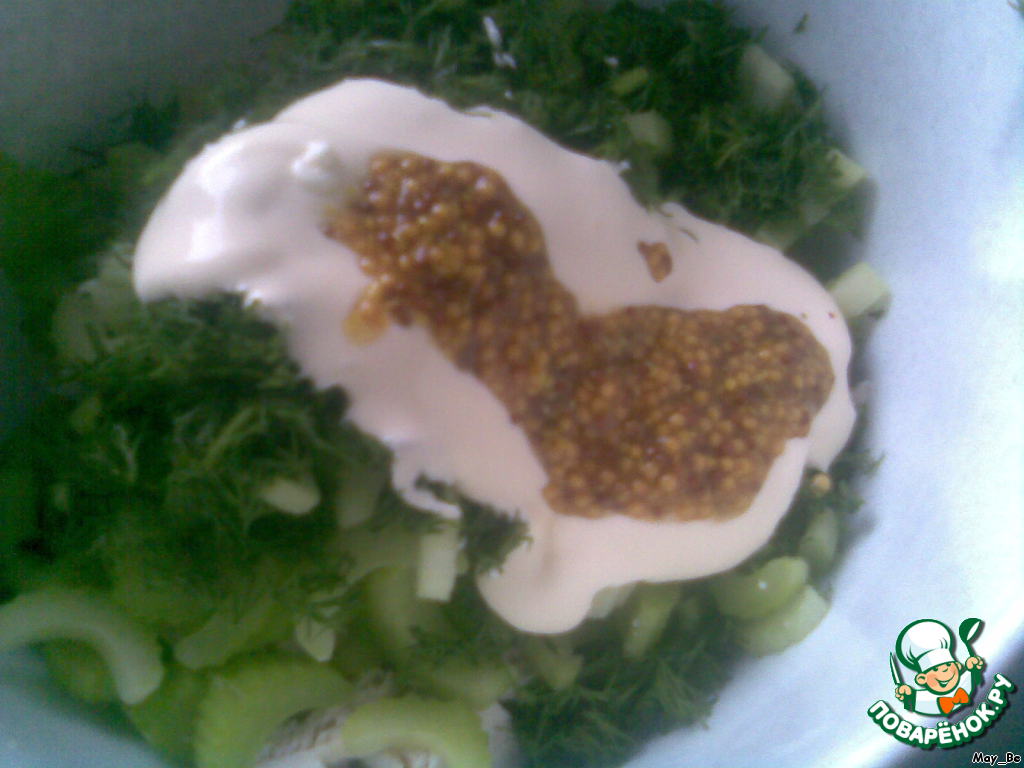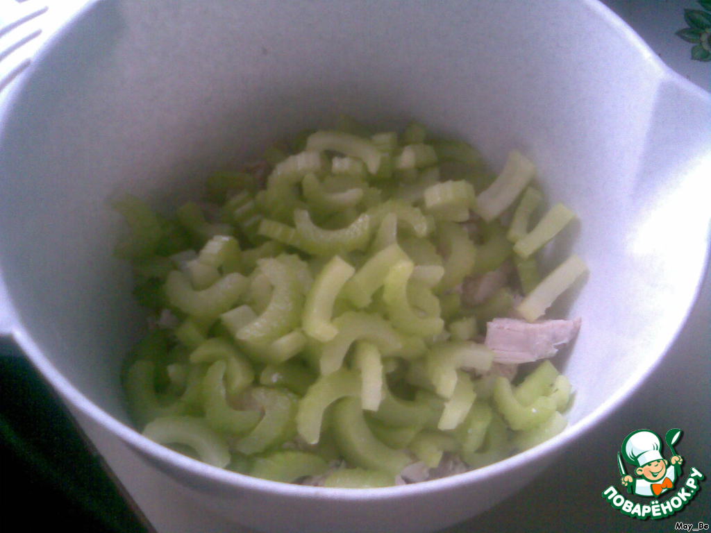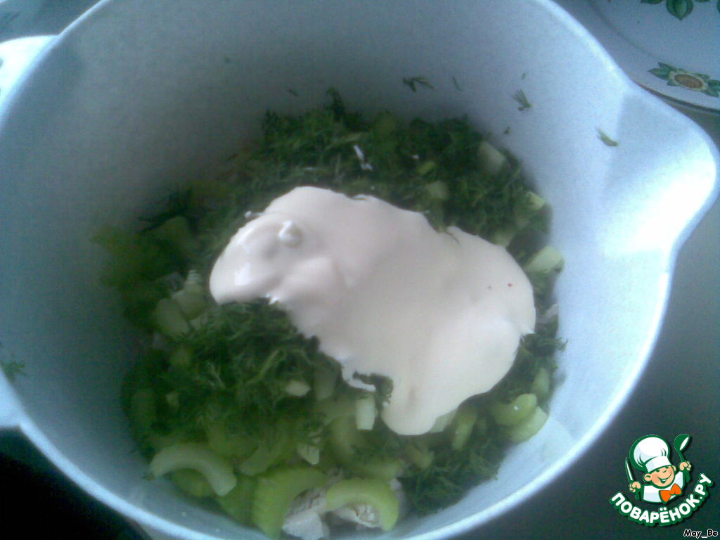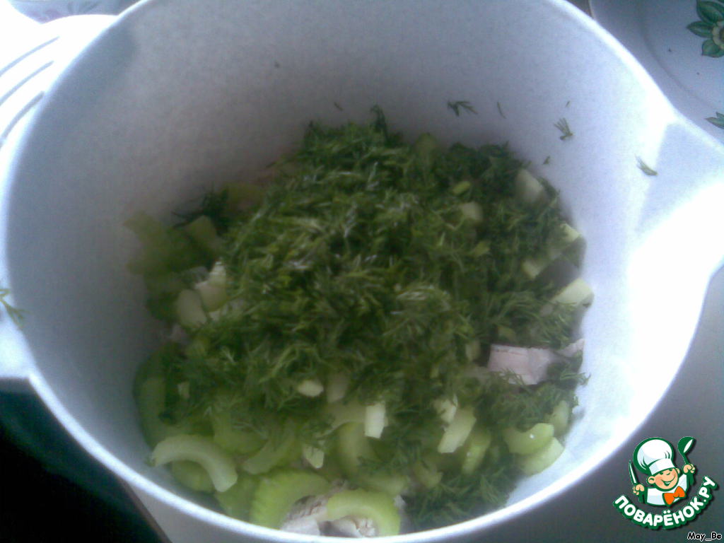 Мелко режем укроп. Добавляем к курочке и сельдерею.