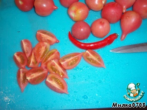 Режем помидорки на четвертинки (если черрики, то достаточно разрезать пополам).