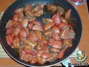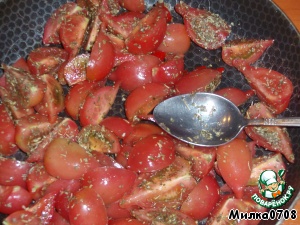 В форму для запекания выкладываем помидорки, добавляем перец чили, прованские травы и отправляем в разогретую до 200 градусов дховку минут на 15.