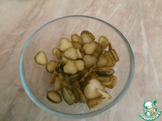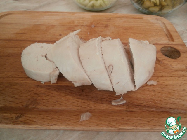 Куриное филе и шампиньоны отварить в двух отдельных кастрюлях, дать стечь воде, охладить. Я приготовил куриную грудку на пару. А шампиньоны я бланшировал в течении 5 минут в кипящей воде.