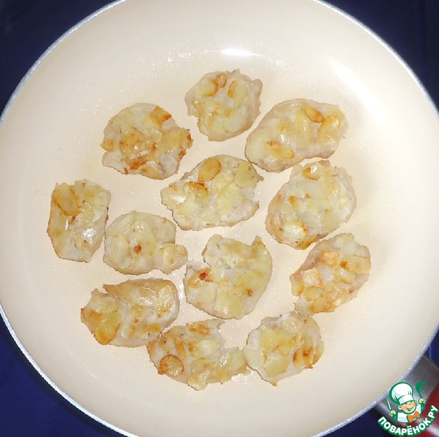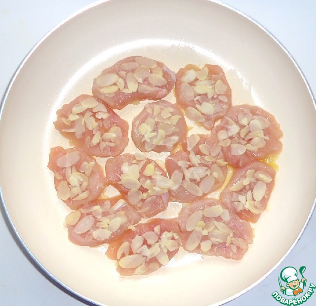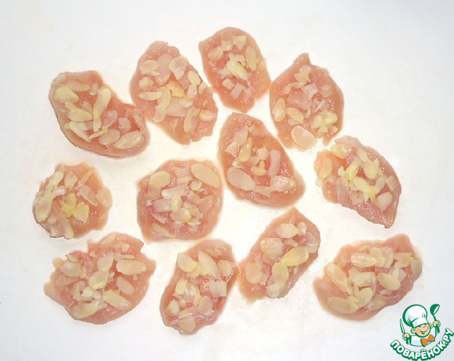 Обвалять в миндальных лепестках. Лепестки нужно хорошо придавить к кусочкам курицы.
