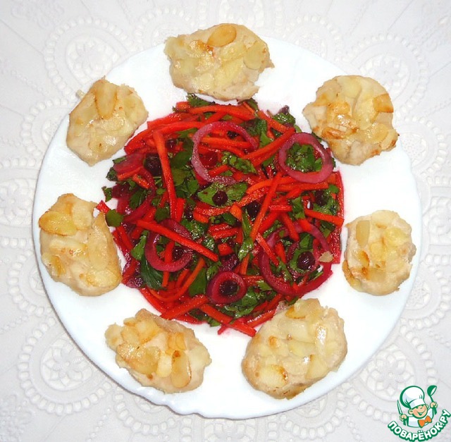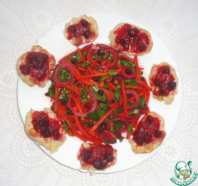 | Яркий салат с кусочками курицы и брусничным соусом. Такой необычный салат на любителя, но нам понравился. Рецепт был найден на просторах интернета. |