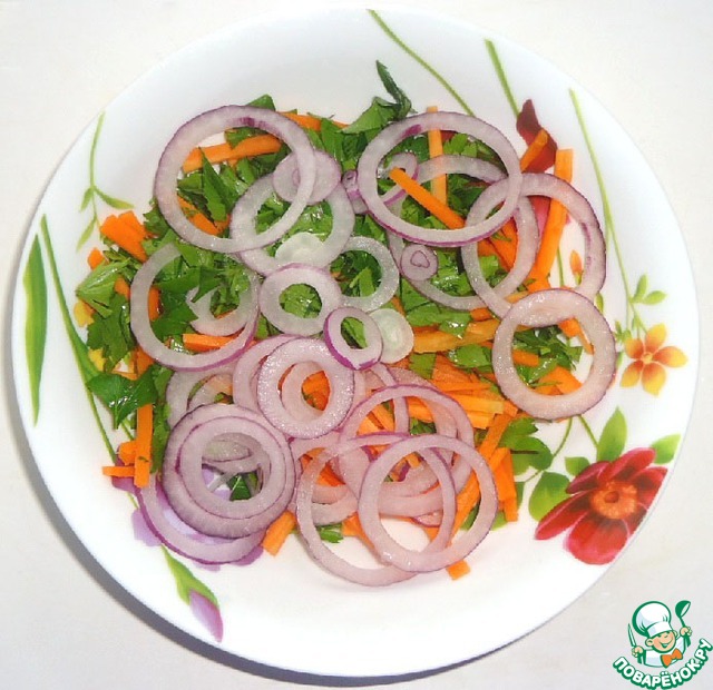 Добавить в салат 1-1,5 ст. л. брусничного соуса, соль и хорошо перемешать. Оставить салат, чтобы он немного замариновался.