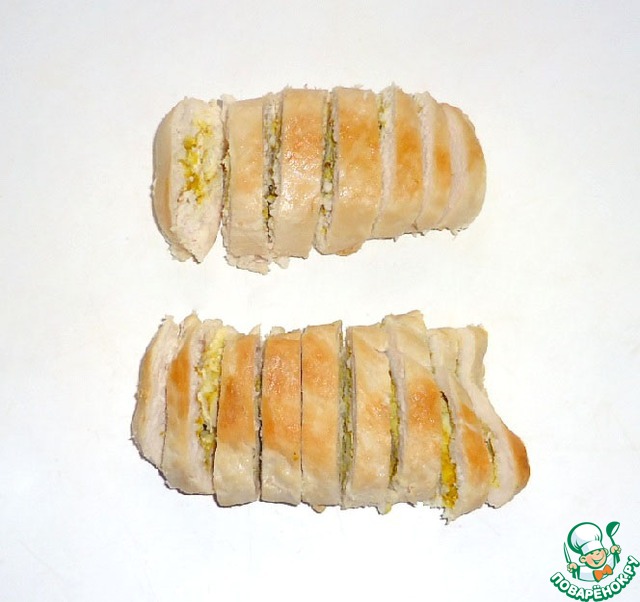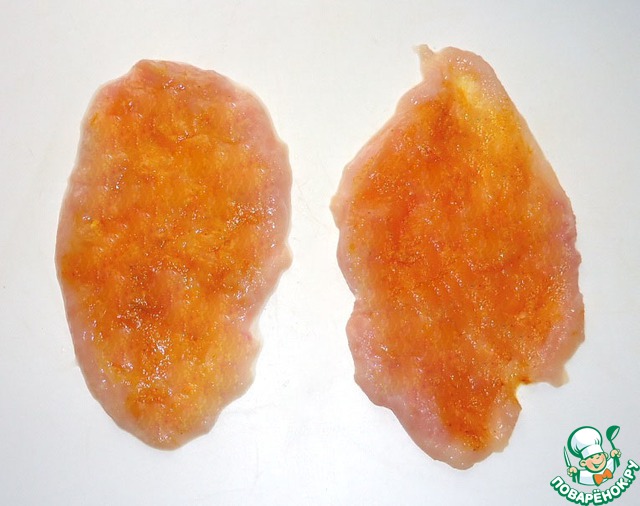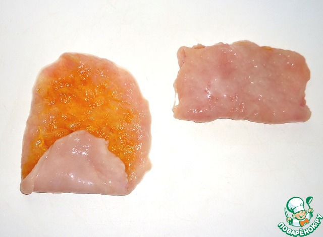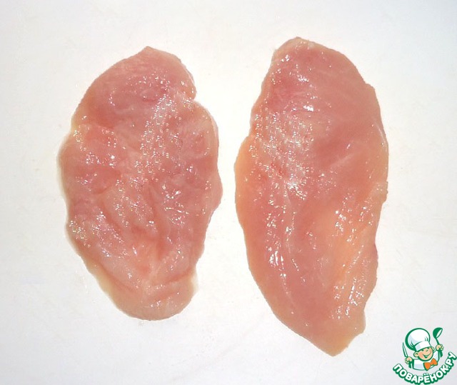 С куриного филе убрать лишнее масло с помощью салфетки и нарезать на кусочки, как показано на фото.