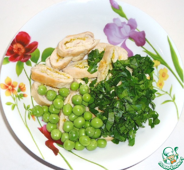 Свежий зеленый горошек (можно замороженный) отварить в течение 3 - 5 минут, слить воду, охладить, добавить в салатник к курице и зелени.