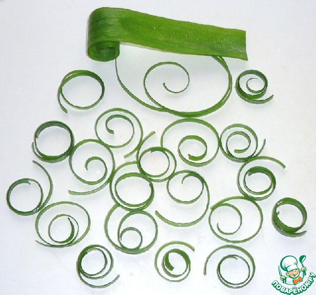Для украшения салата и как дополнительный ингредиент нам понадобится зеленый лук. Перья зелёного лука нужно развернуть, разрезать пополам и каждую половинку нарезать на тонкие полоски, которые сами будут сворачиваться.