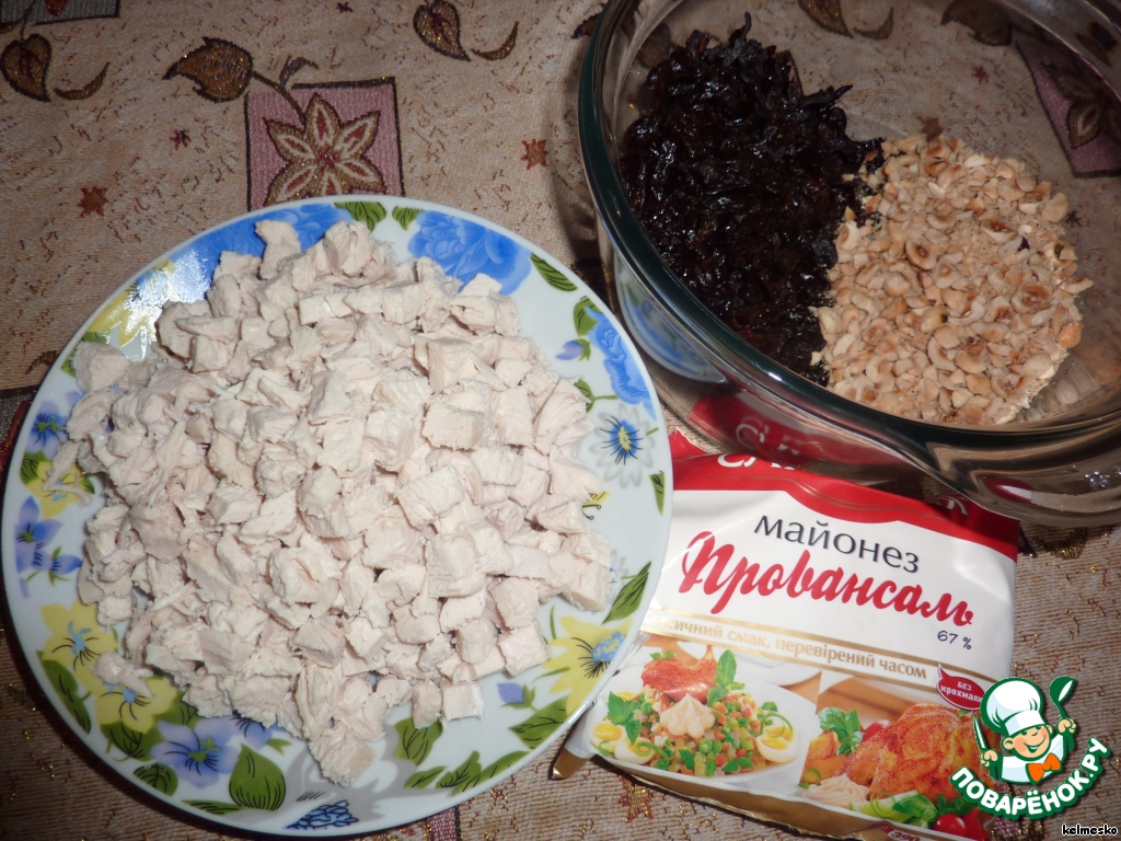 Филе моем, чистим от пленочек и отвариваем в подсоленной воде. Пока курочка остывает, займемся черносливом, который просто нарезаем соломкой.