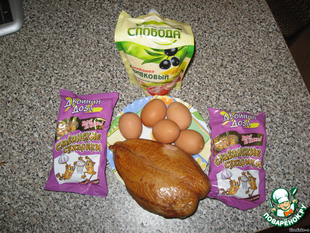 Смешать в большом салатнике "яичную соломку", волокна копченой курицы и сухарики со вкусом чеснока. Заправить майонезом. Для пикантности и остроты можно в салат выдавить пару зубчиков чеснока
