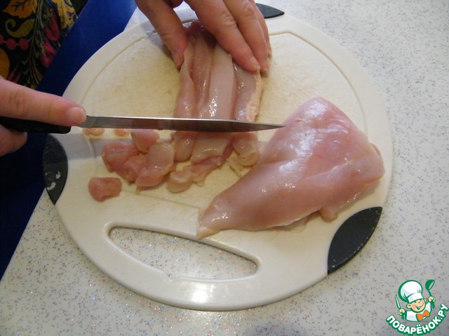 Обжариваем филе вместе с предварительно нарезанным луком.