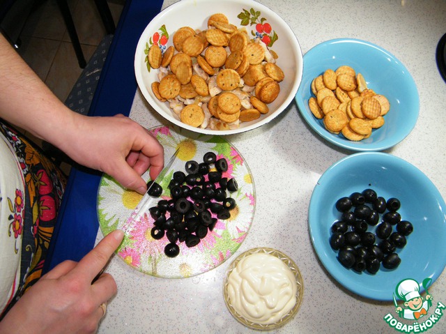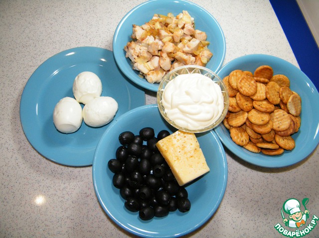 Подготавливаем необходимые ингредиенты: обжаренное филе, яйца, майонез, оливки, сыр, крекер.
