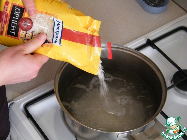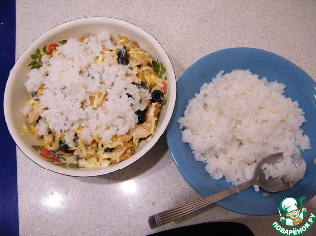В качестве украшения укладываем сверху слой риса. На слой риса раскладываем крекер с оливками.