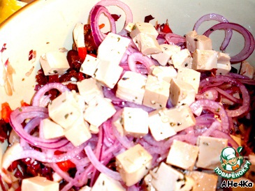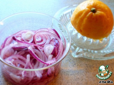 Красный лук тоже маринуем в 2 столовых ложках лимонного сока, разведенного небольшим кол-вом воды с добавлением 1 ч.л. сахара.