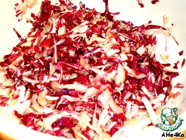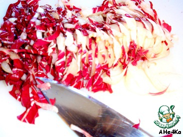 Теперь займёмся непосредственно салатом: "Радичио" моем, обсушиваем и тонко шинкуем.