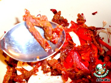 Далее очередь вяленых помидоров. Я купила уже нарезанные, если в у вас целые, то тоже нарежьте их соломкой.