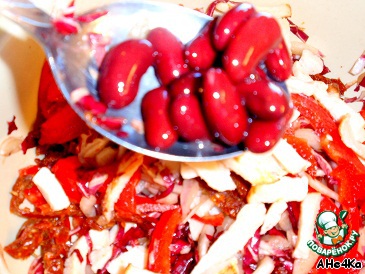 Фасоль опрокинуть на дуршлаг, дать жидкости стечь и тоже добавить в салат.