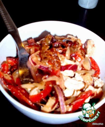 | Для этого салата я ничего не покупала специально. Просто захотелось чего-то нового и придумался вот такой вот сочный и красочный салатик, из находившихся дома продуктов. Нам салат пришeлся по вкусу, так что я буду делать его ещe, заодно решила и с вами поделиться рецептом)). Салат получается лeгким и в тоже время сытным, благодаря курочке. Понравится тем, кто любит свежие салатики без майонеза)). |