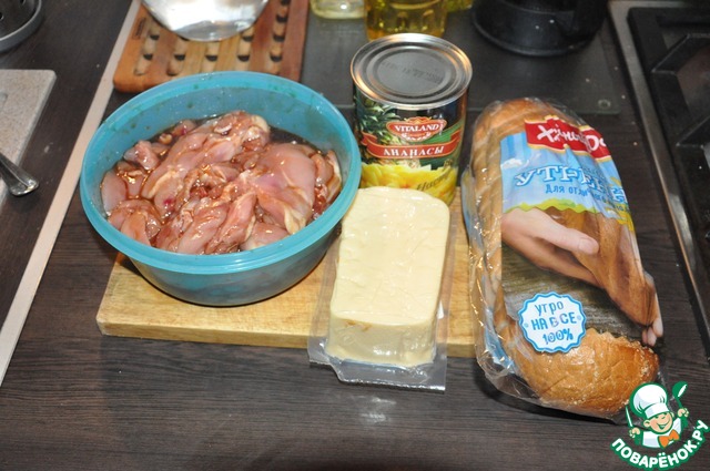 Когда сухарики, курица остынут, то все ингредиенты смешиваем. Ананасы кусочками из банки можно еще чуть порезать, можно кусочки оставить как есть. Добавляем майонез.