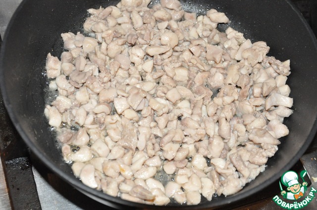 Режем филе на маленькие кусочки, перчим, солим и на сковородку. Масла поменьше.