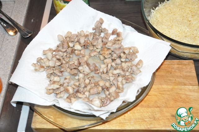 Готовую курицу откидываем на салфетки, дабы избавиться от лишнего масла и остудить курицу.