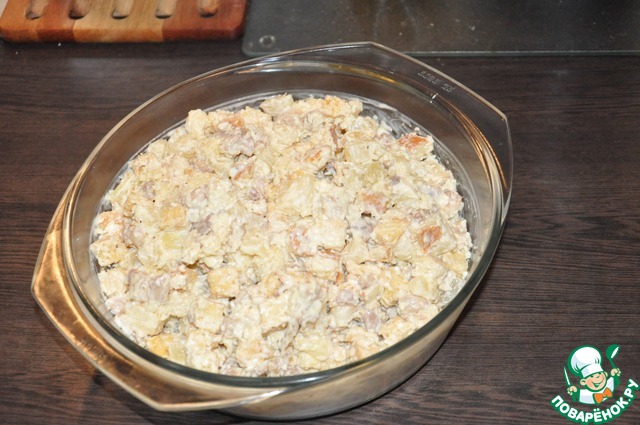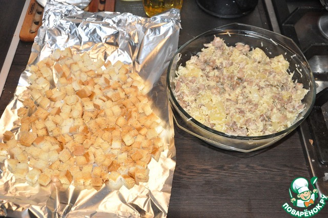 Если салат готовится заранее, то сухарики лучше добавлять перед подачей на стол.