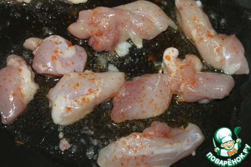 Куриное филе вымыть, обсушить, нарезать полосками. Обжарить на растительном масле с добавлением красной молотой паприки (чуть-чуть посолить).