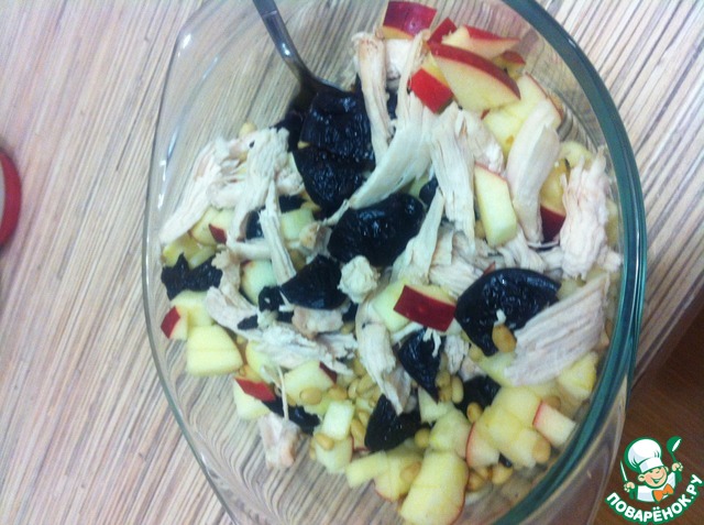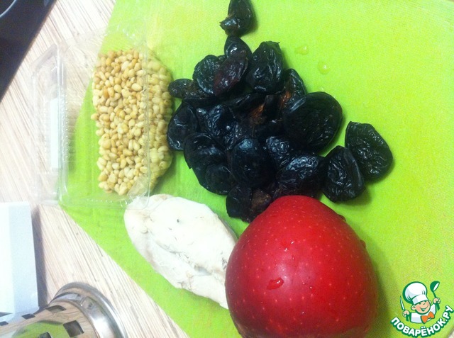 Подготовим ингредиенты: грудку отварить, яблоко и чернослив помыть